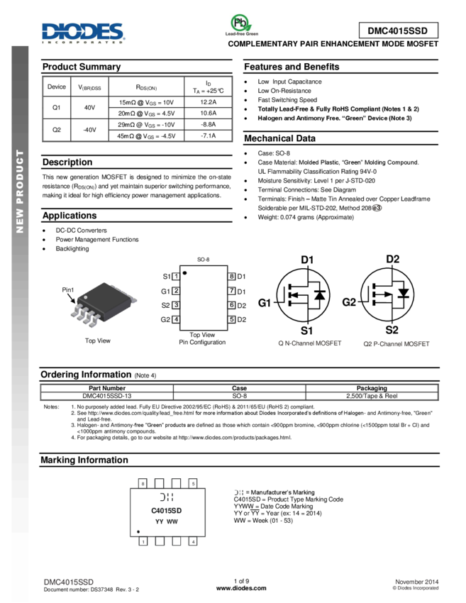 DMC4015SSD COMPLEMENTARY PAIR ENHANCEMENT MODE MOSFET