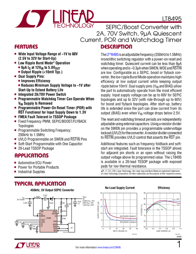 LT8495 SEPIC/Boost Converter with 2A, 70V Switch, 9μA Quiescent Current, POR and W...