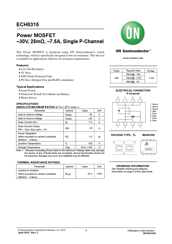 ECH8315 Power MOSFET, -30V, 25mΩ, -7.5A, Single P-Channel