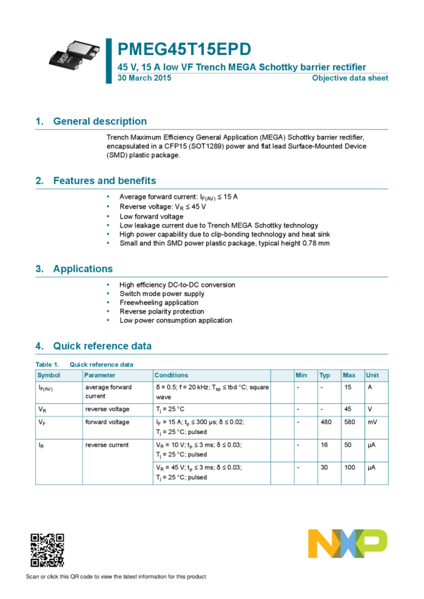 PMEG45T15EPD 45 V, 15 A low VF Trench MEGA Schottky barrier rectifier