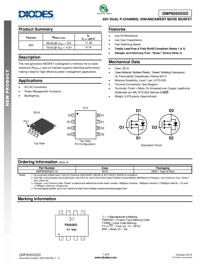 DMP6050SSD 60V DUAL P-CHANNEL ENHANCEMENT MODE MOSFET