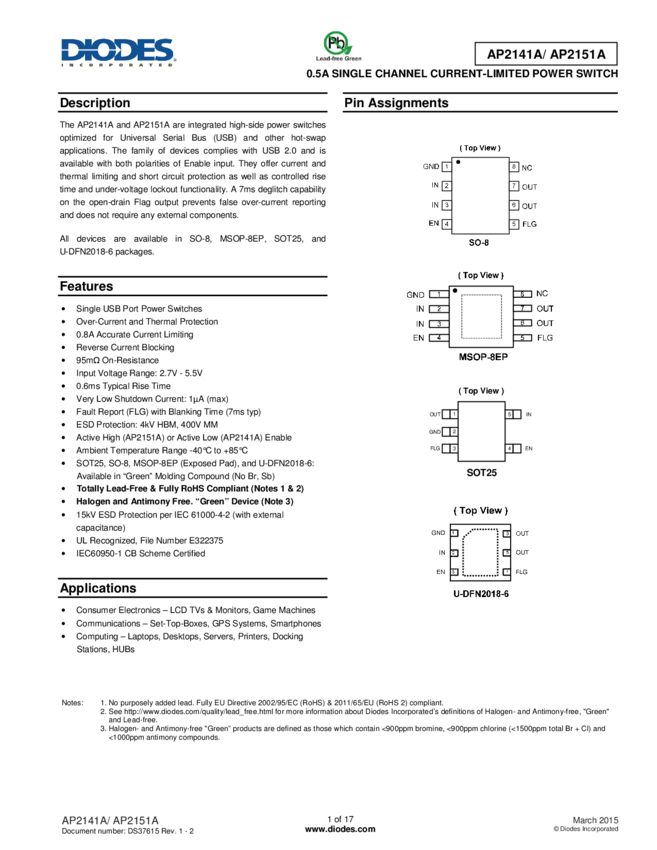 AP2141A 0.5A SINGLE CHANNEL CURRENT-LIMITED POWER SWITCH