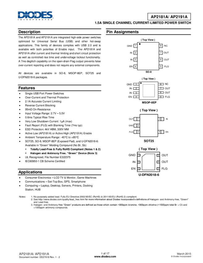 AP2191A 1.5A SINGLE CHANNEL CURRENT-LIMITED POWER SWITCH