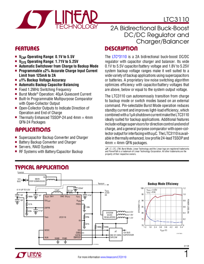 LTC3110 2A Bidirectional Buck-Boost DC/DC Regulator and Charger/Balancer
