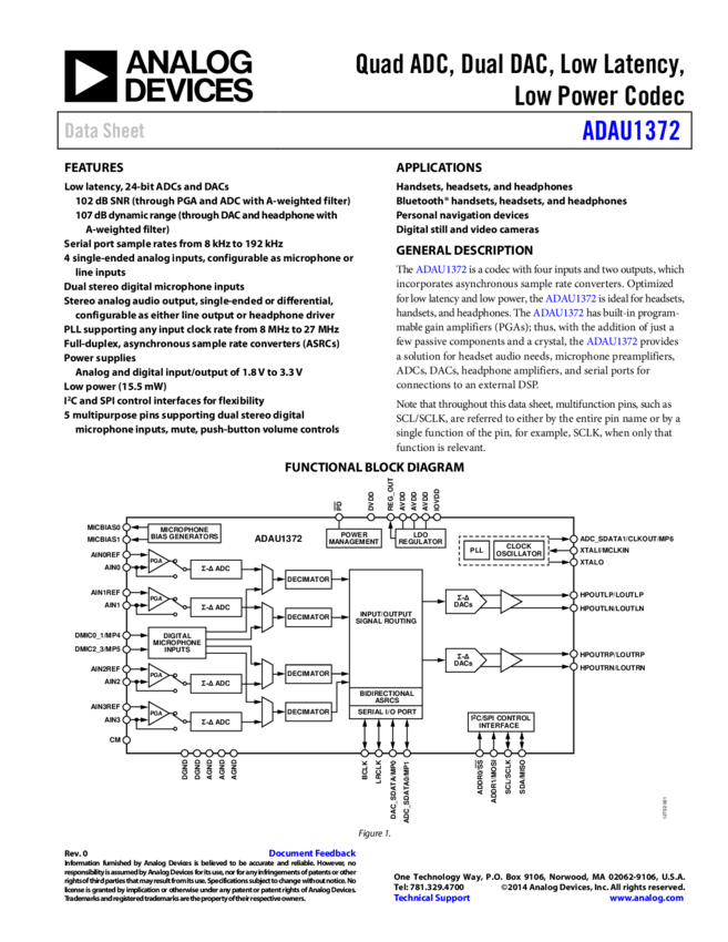 ADAU1372 Quad ADC, Dual DAC, Low Latency, Low Power Codec