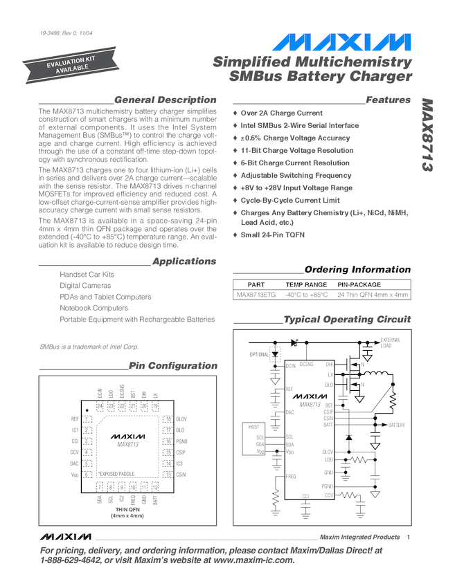 MAX8713 Simplified Multichemistry SMBus Battery Charger