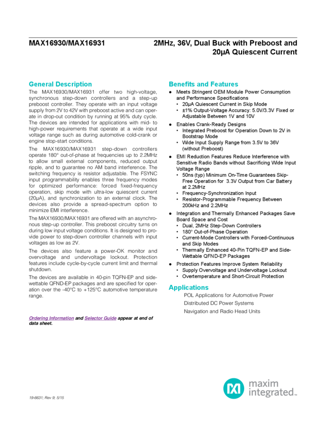 MAX16931 2MHz, 36V, Dual Buck with Pre-Boost and 40uA Quiescent Current