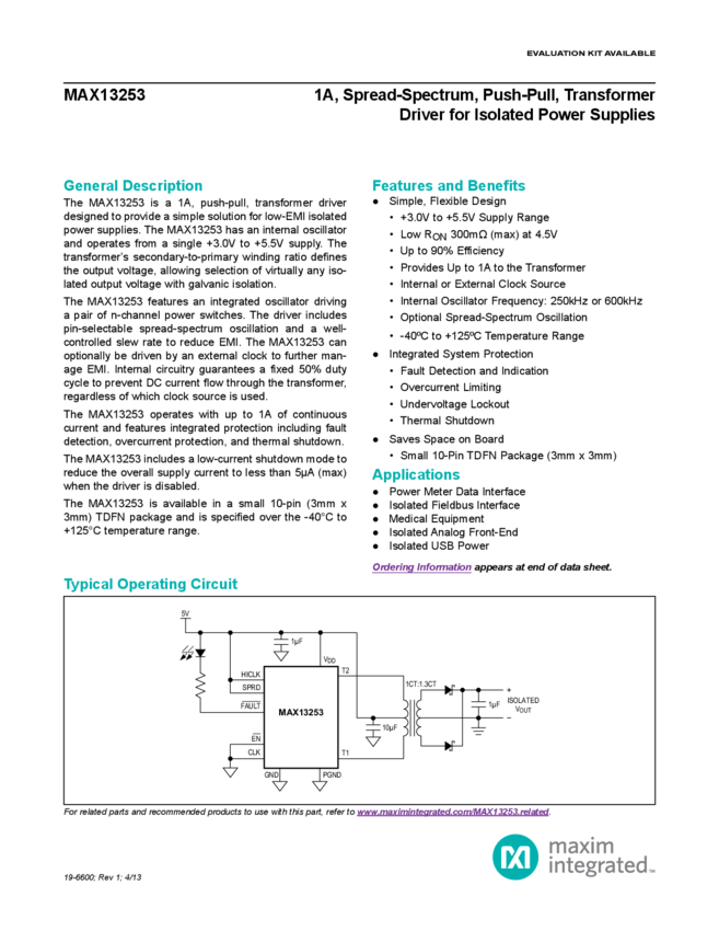 MAX13253 1A Spread-Spectrum Push-Pull Transformer Driver for Isolated Power Supplies
