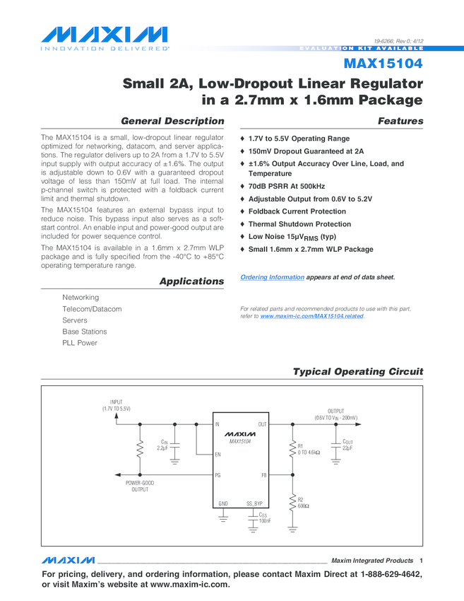 MAX15104 Small 2A, Low-Dropout Linear Regulator in a 2.7mm &#215 1.6mm Package