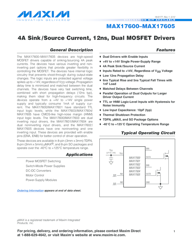 MAX17605 Dual, 12ns, 4A Sink/Source Current, MOSFET Drivers