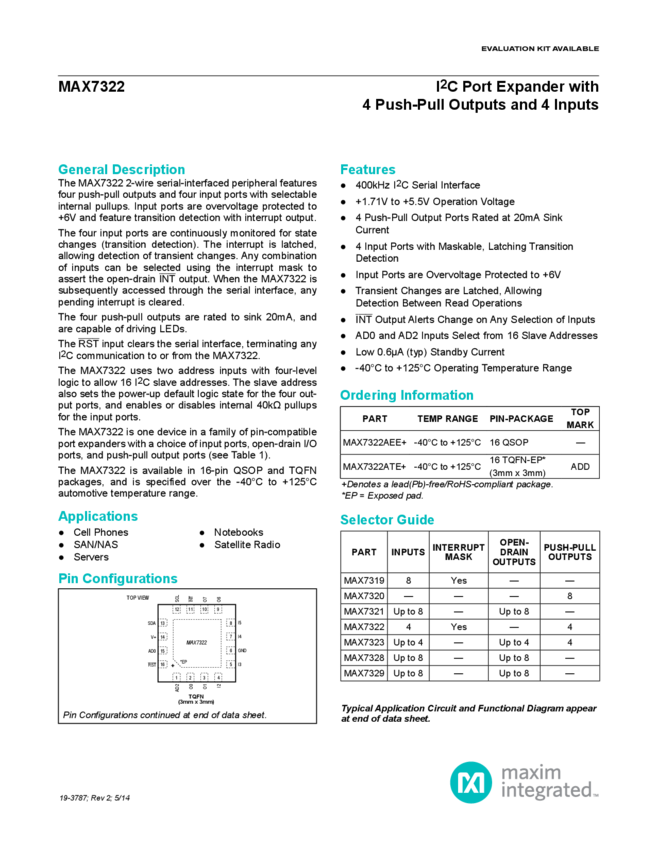 MAX7322 I2C Port Expander with 4 Push-Pull Outputs and 4 Inputs