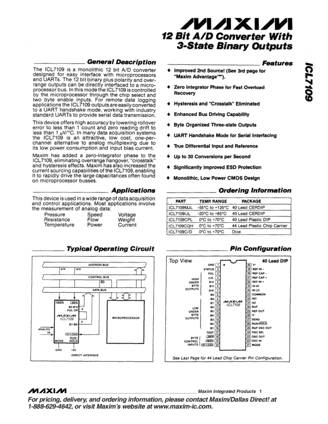 ICL7109 12-bit A/D Converter with 3-State Binary Outputs