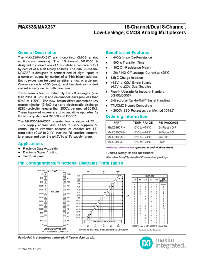 MAX337 Dual 8-Channel, Low-Leakage, CMOS Analog Multiplexer