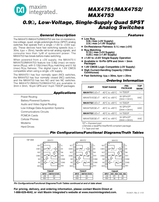 MAX4753 0.9ohm, Low-Voltage, Quad SPST Analog Switch