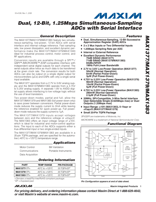 MAX1383 Dual 12-bit,1.25 Msps, 2-Channel Differential/ 4-Channel Single-ended Input...
