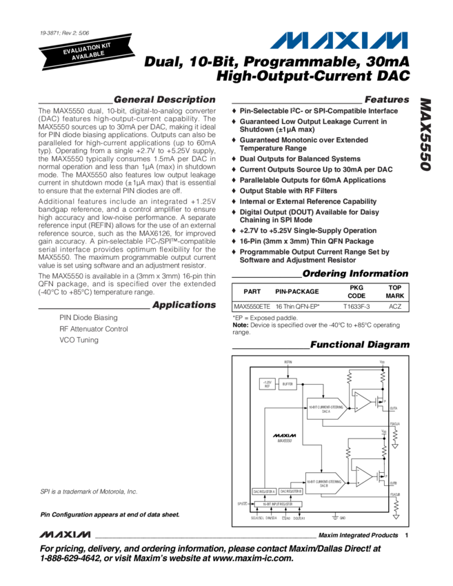 MAX5550 Dual 10-Bit 30mA High Ouput Current DAC