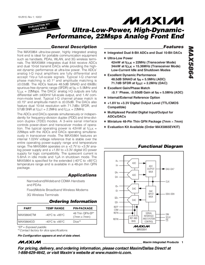 MAX5864 Ultra-Low-Power, High Dynamic Performance 22Msps Analog Front End