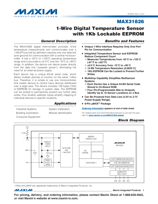 MAX31826 1-Wire Digital Temperature Sensor with 1Kbit Lockable EEPROM