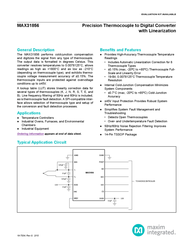 MAX31856 Precision Thermocouple to Digital Converter with Linearization