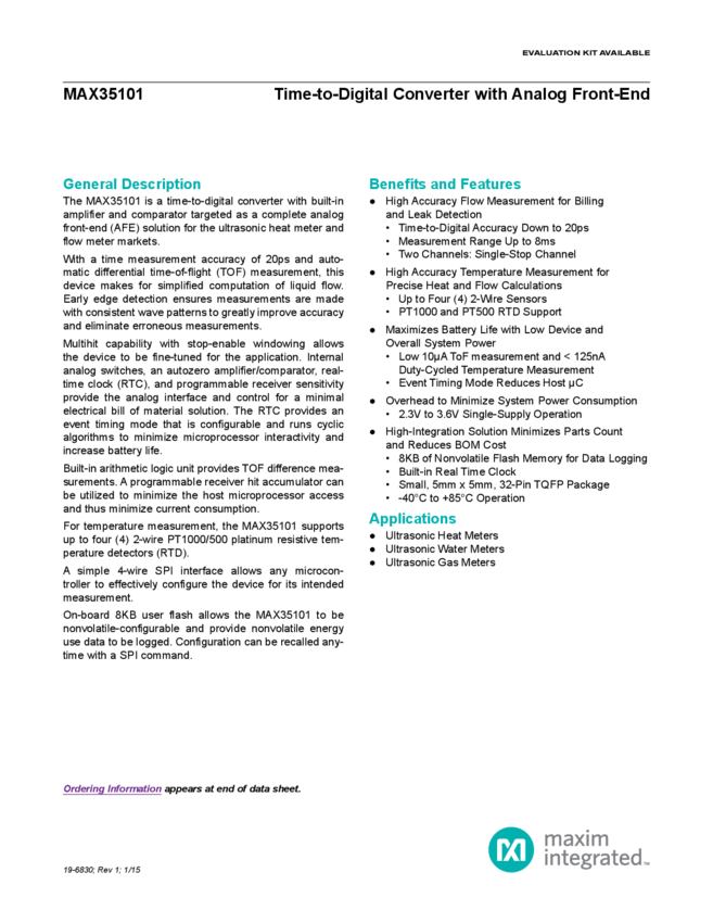 MAX35101 Ultrasonic Time-To-Digital Converter with Analog Front End and RTC/FLASH