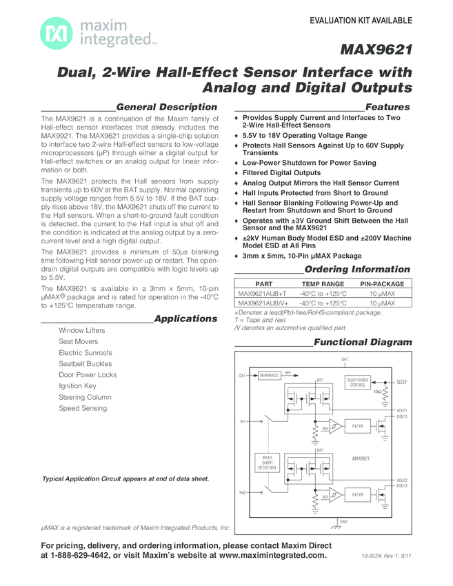 MAX9621 Dual, 2-Wire Hall-Effect Sensor Interface with Analog and Digital Outputs