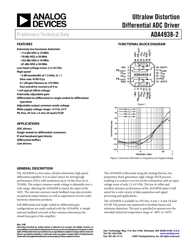 ADA4938-2 Ultralow Distortion Differential ADC Driver (Dual)