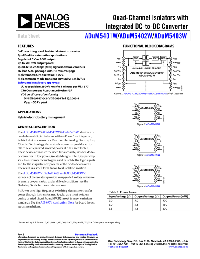 ADUM5401 Quad-Channel Isolators with Integrated DC/DC Converter (3/1 channel directi...