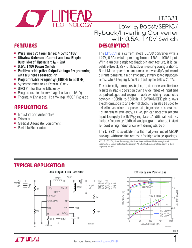 LT8331 Low IQ Boost/SEPIC/ Flyback/Inverting Converter with 0.5A, 140V Switch