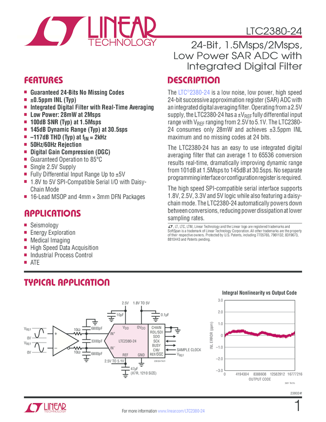 LTC2380-24 24-Bit, 1.5Msps/2Msps, Low Power SAR ADC with Integrated Digital Filter
