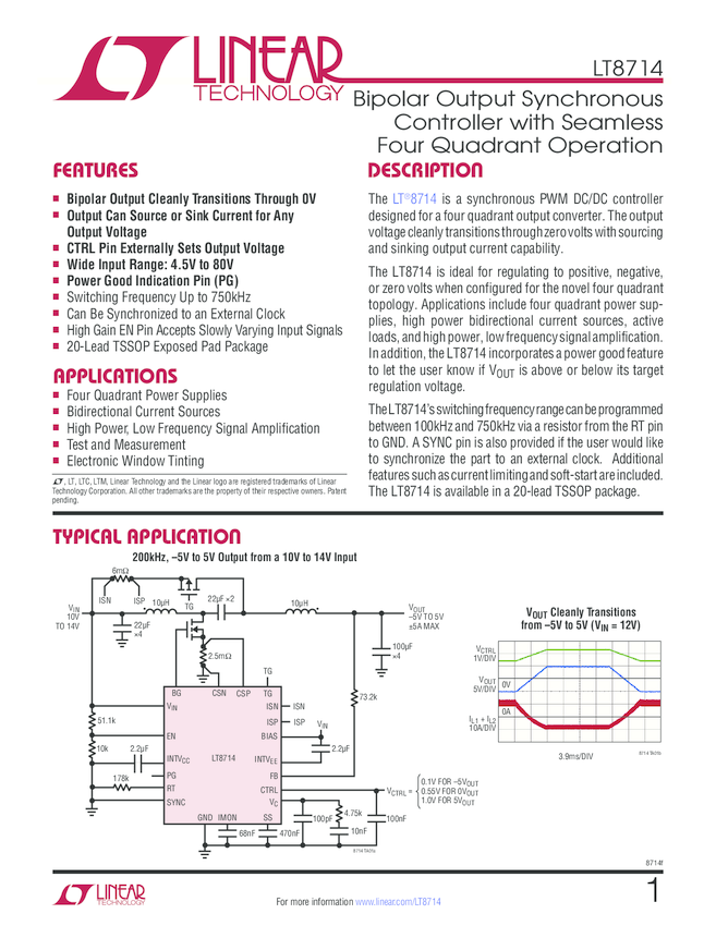 LT8714 Bipolar Output Synchronous Controller with Seamless Four Quadrant Operation