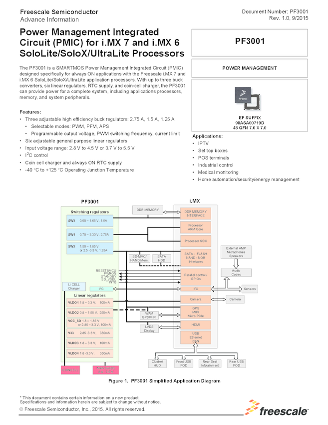 PF3001, Power Management Integrated Circuit (PMIC) for i.MX 7 and i.MX 6 SoloLite/SoloX/UltraLite Processors - Data...