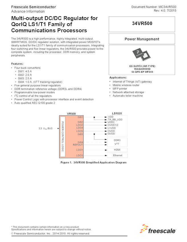 MC34VR500, Multi-output DC/DC Regulator for QorIQ LS1/T1 Family of Communications Processors