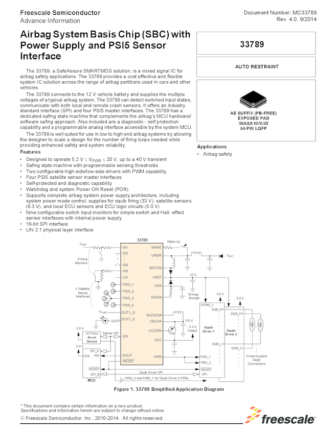 MC33789 MC33789, Airbag System Basis Chip (SBC) with Power Supply and PSI5 Sensor I...