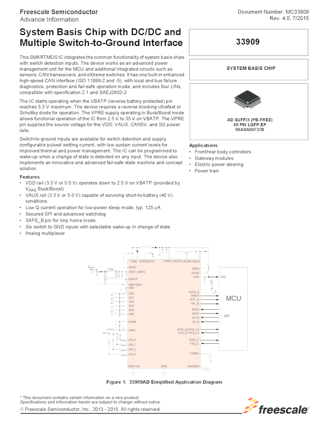 MC33909 MC33909, System Basis Chip with DC/DC and Multiple Switch-to-Ground Interfa...