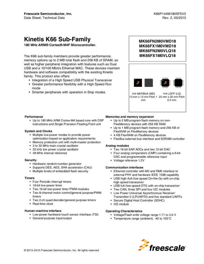 Kinetis K66: 180MHz Cortex-M4F up to 2MB Flash (144pin)