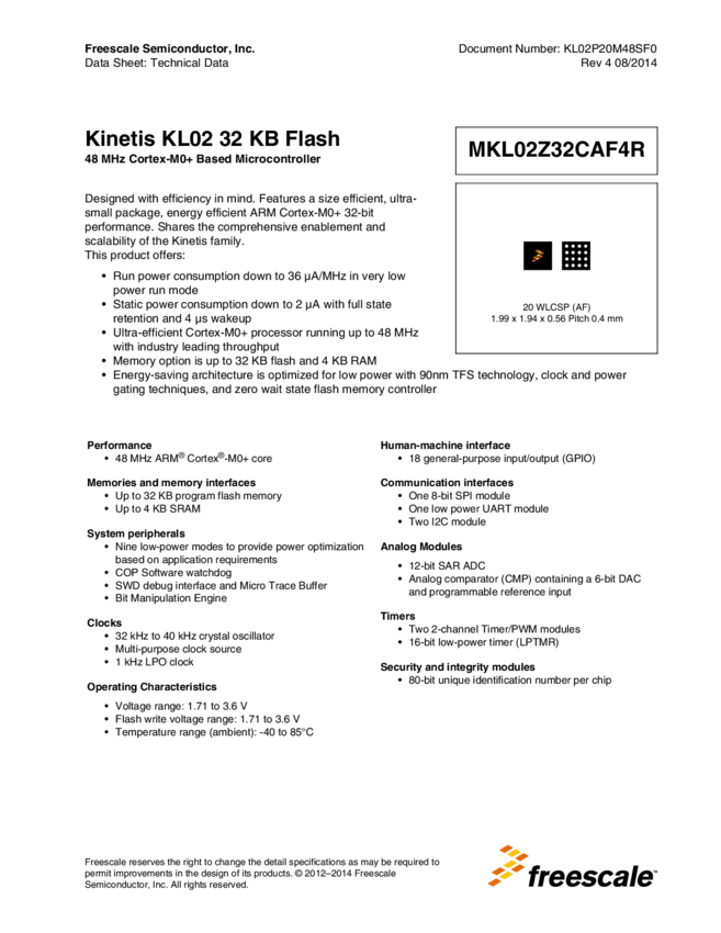 KL0 Kinetis KL02: 48MHz Cortex-M0+ 32KB Flash (20 WLCSP)