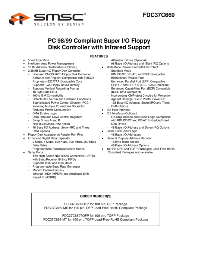 FDC37C669 PC98/99 Compliant Super I/O Floppy Disk Controller with Infrared Supp (06/29/2007)