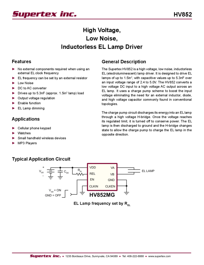 HV852 Datasheet - HV, Low Noise, Inductorless EL Lamp Driver (10/23/2009)