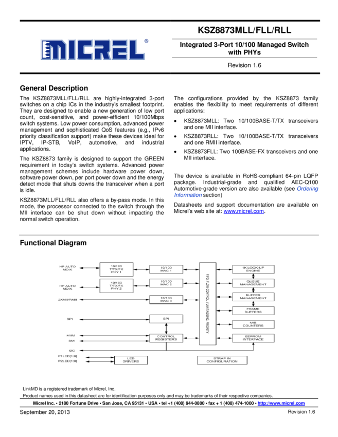 KSZ8873 MLL/FLL/RLL - Integrated 3-Port 10/100 Managed Switch with PHYs (11/09/2015...
