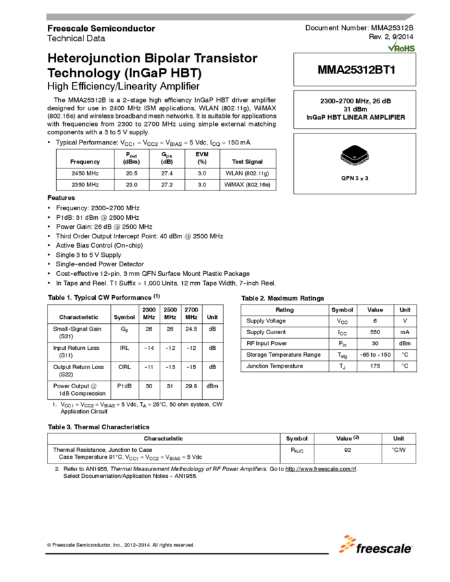 MMA25312BT1 2300-2700 MHz, 26 dB, 31 dBm InGaP HBT Linear Amplifier