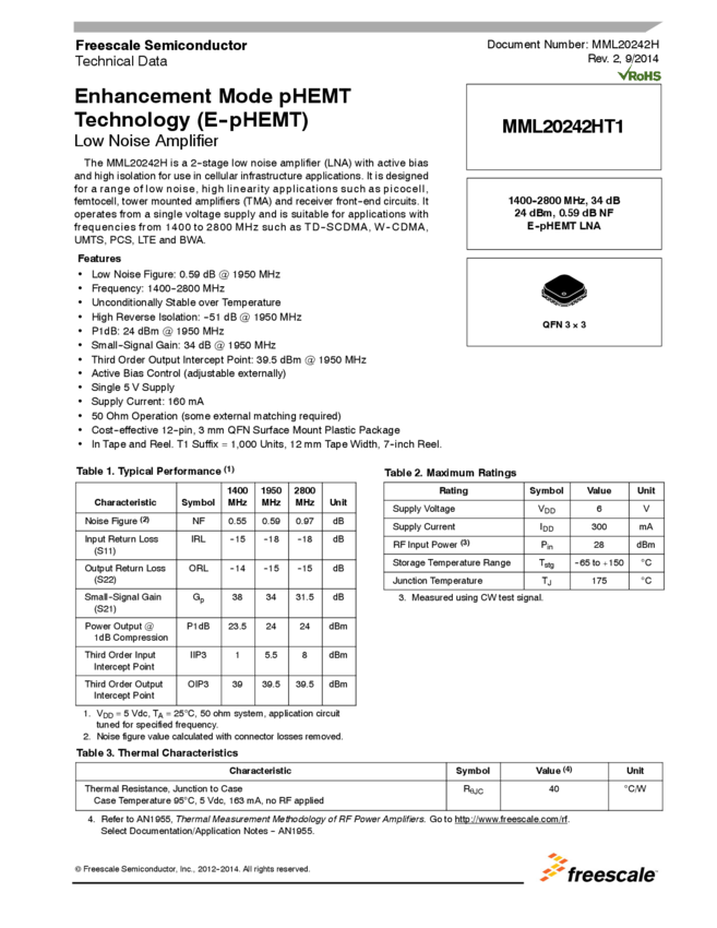 MML20242HT1 1400-2800 MHz, 34 dB, 24 dBm, 0.59 dB NF E-pHEMT LNA