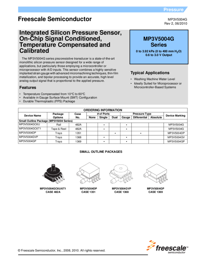 MPXx5004 MP3V5004G, Integrated Silicon Pressure Sensor, On-Chip Signal Conditioned,...