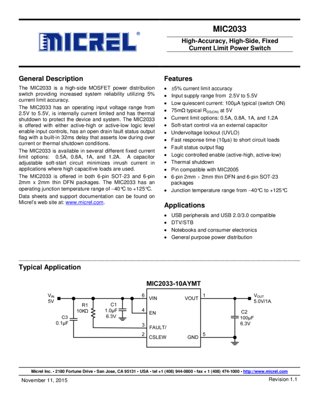 MIC2033 - High-Accuracy, High-Side, Fixed Current Limit Power Switch (11/12/2015)