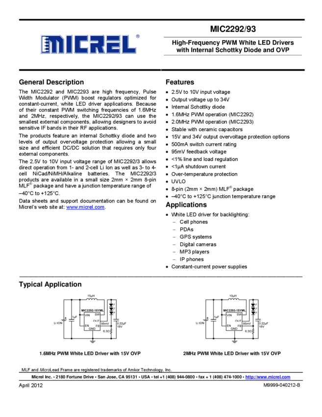 MIC2292/3 - High-Frequency PWM White LED Drivers with Internal Schotty Diode OVP (11/05/2015)