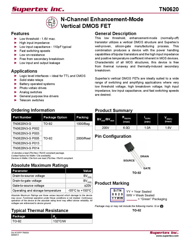 TN0620 Datasheet - N-Channel Enhancement-Mode Vertical DMOS FET (06/27/2014)