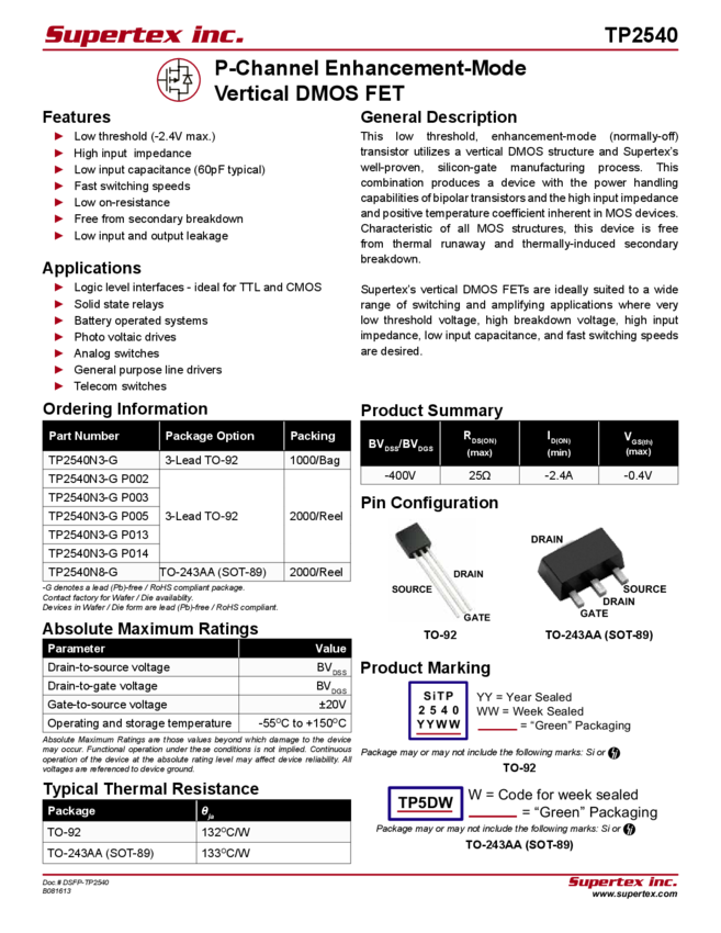 TP2540 Datasheet - P-Channel Enhancement-Mode Vertical DMOS FET (06/27/2014)