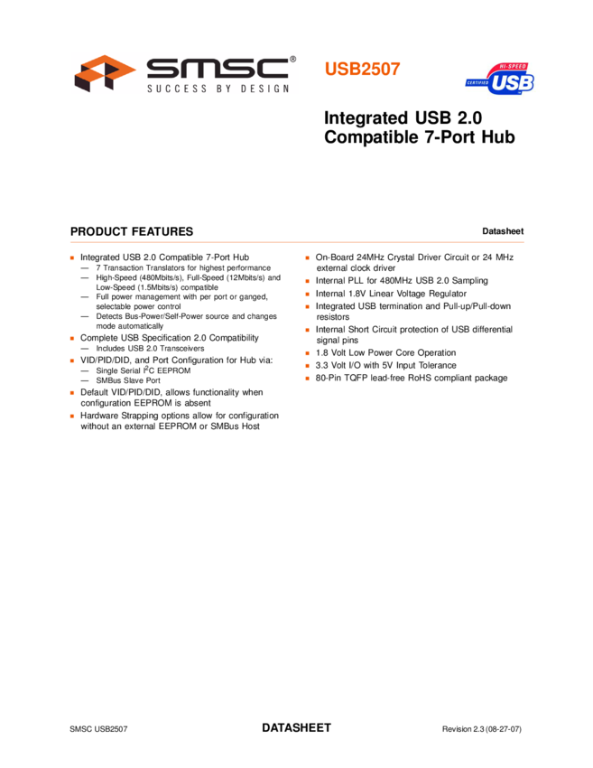 USB2507 Integrated USB 2.0 Compatible 7-Port Hub Data Sheet (08/27/2007)