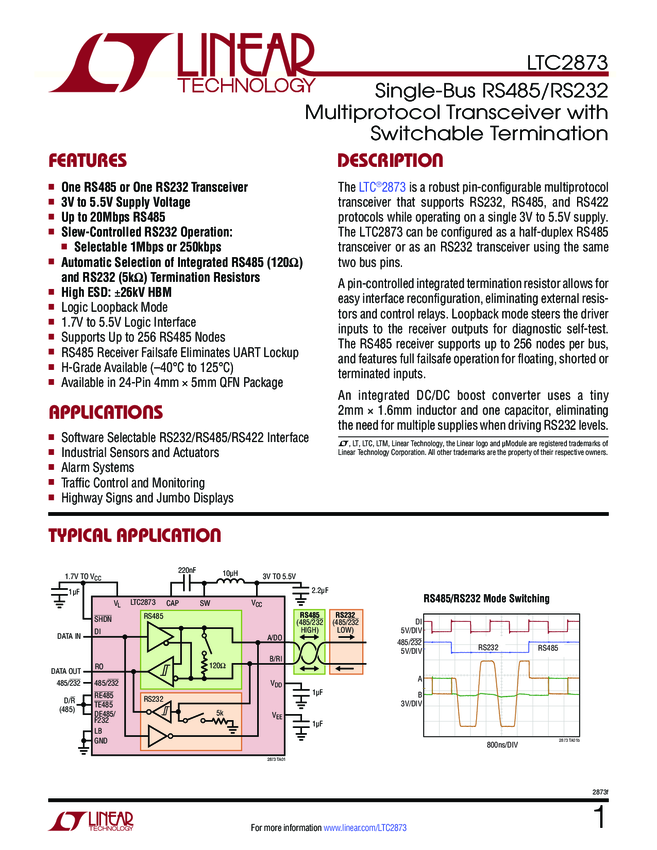 LTC2873 Single-Bus RS485/RS232 Multiprotocol Transceiver with Switchable Terminatio...