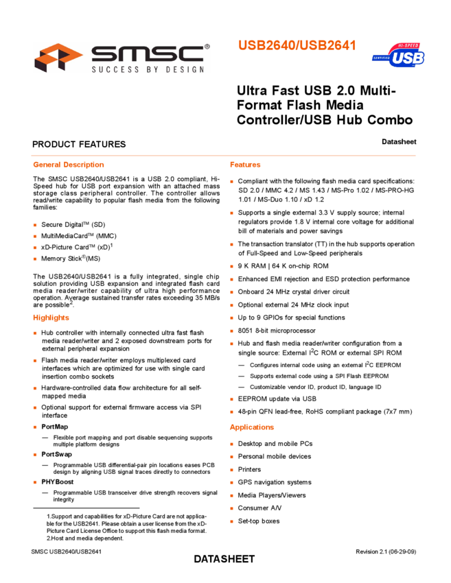 USB2640/USB2641 Ultra Fast USB 2.0 Multi-Format Flash Media Controller/USB Hub