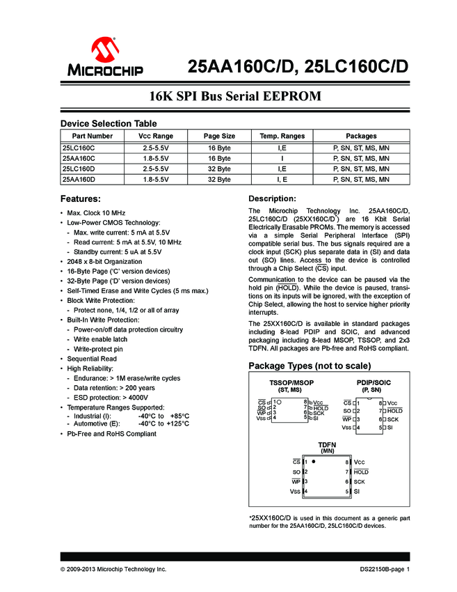 25AA160C/D, 25LC160C/D 16K SPI Bus Serial EEPROM Data Sheet (01/07/2013)